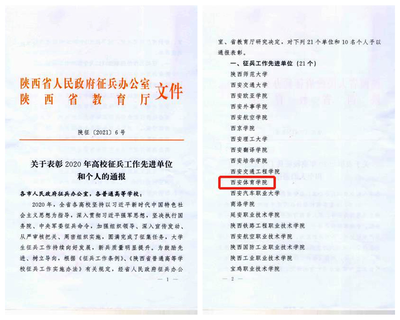 本网讯 日前,陕西省人民政府征兵办公室、陕西省教育厅签发《关于表彰2020年度高校征兵工作先进单位和个人的通报》(陕征〔2021〕6号),我校荣获2020年陕西省高校征兵工作先进单位。
