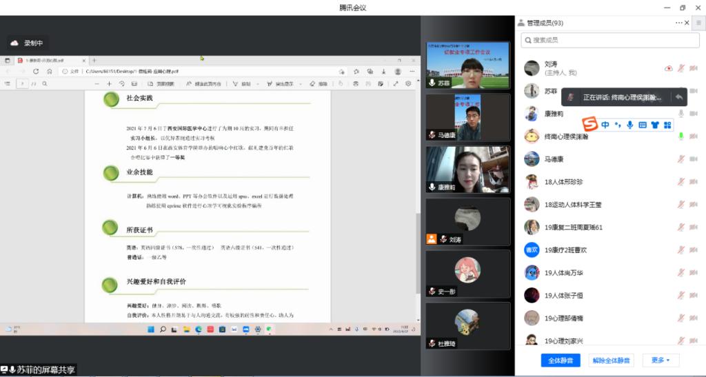 本网讯 为落实2022届全省高校毕业就业工作推进会议精神,为学生搭建就业平台,促进学院就业工作,运动与健康科学学院经过认真筹划,4月22日召开“用人单位大走访,全员联动促就业”线上就业会议。副校长陈彦、运动与健康科学学院党委书记刘勇、院长刘涛,运动创伤医院院长何昌谋,就业指导中心主任王鹏以及学院全体无课老师和2018级全体学生参加会议。会议邀请20余家实习单位代表、10余位优秀校友参加。会议由副院长刘军主持。