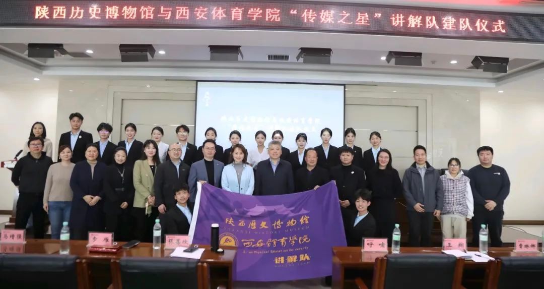 本网讯 3月19日,我院举行陕西历史博物馆西安体育学院“传媒之星”讲解队建队仪式。陕西历史博物馆副馆长步雁、我校副校长张葆欣,体育新闻与传媒学院党委书记马增强、副院长王翔、姚静,陕西历史博物馆社会教育部主任呼啸、大学生讲解中心主任曹琳娜出席,传媒学院教师、陕历博西体讲解队领队霍欣,陕西历史博物馆大学生讲解中心主管冯可心及师生代表参加。