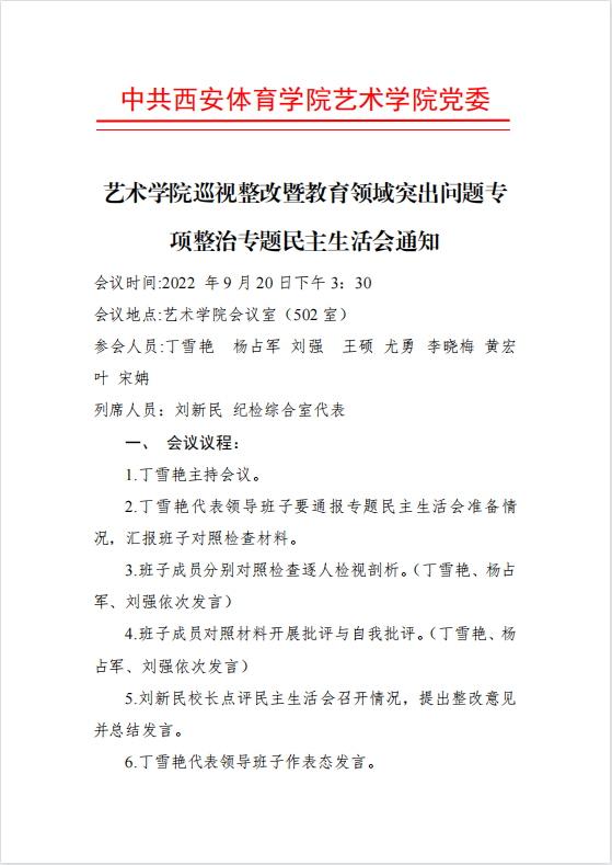 艺术学院巡视整改暨教育领域突出问题专项整治专题民主生活会通知