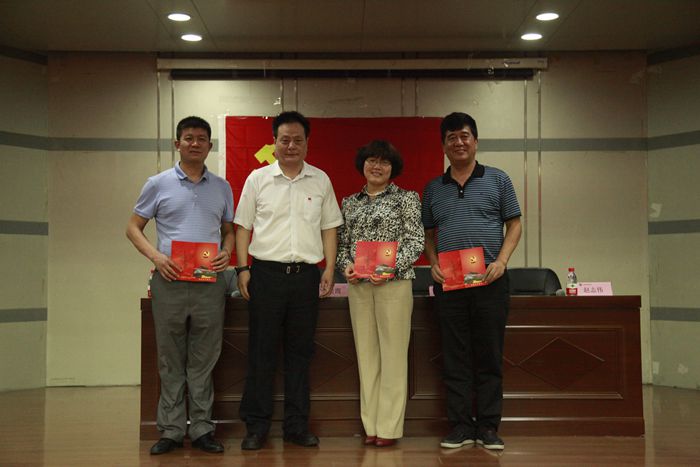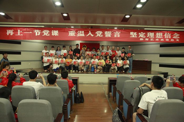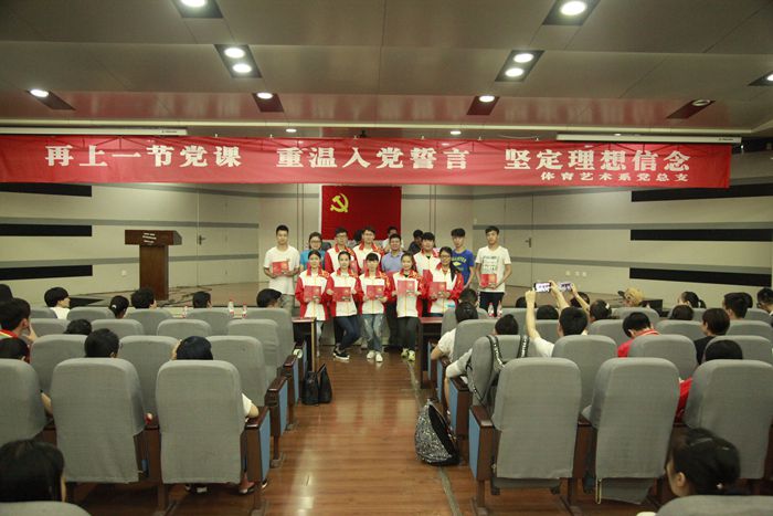 为庆祝建党94周年,6月30日下午,体育艺术系党总支组织全体党员及入党积极分子举行“再上一节党课重温入党誓词坚定理想信念”主题活动。活动由系主任赵志伟主持。 党委组织部部长雷甲谋应邀出席本次活动,他在讲话中回顾了党的光辉历程,给全体党员提出了“比贡献、做表率、树榜样”的九字要求,并为该系负责人颁发了政治生日贺卡。