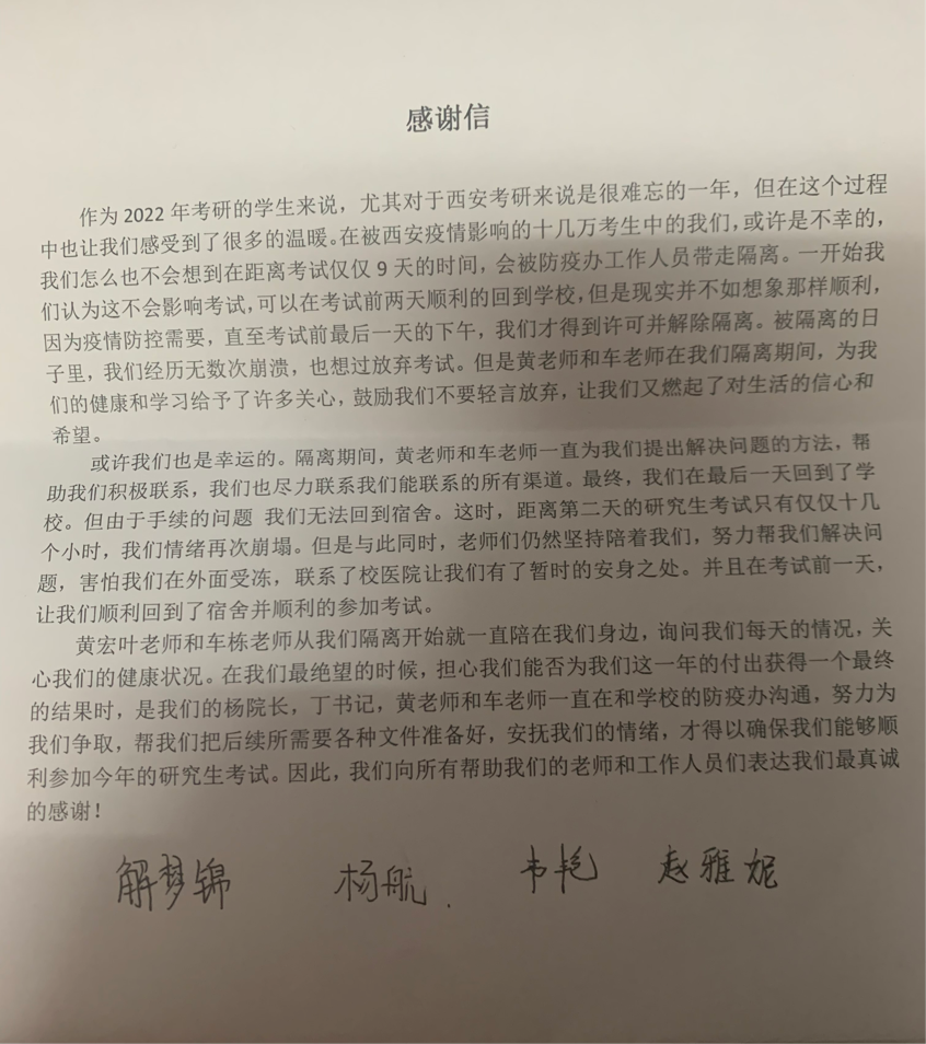 在疫情严峻且正值全国研究生考试之际,我院有四名C类次密接考生被隔离在西安宾馆。防控疫情是命令,心系学生是担当,艺术学院辅导员黄宏叶用实际行动彰显党员干部的初心和使命。