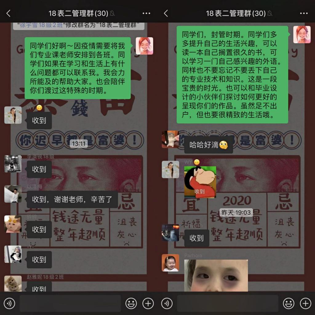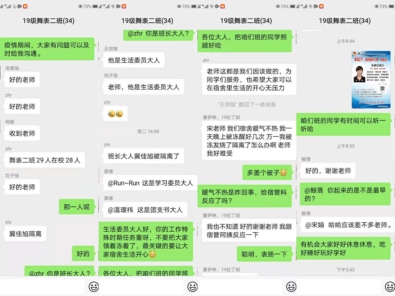 为进一步贯彻落实学生在校封闭期间生活学习情况,通过微信平台进行了“云”走访。用“屏对屏”方式了解学生目前封闭期间生活及学习具体情况,为学生尽可能的解决问题,对有特殊需求、急需解决的做以统计,立即上报学院。同时嘱咐学生做好疫情防控防护,遵守学校要求,每天按时完成核酸检测,勉励学生封闭期间调整心态,认真学习,完成本学期各科课程。虽然受到了疫情封闭的限制,但我院师生隔空不隔爱。线上的走访不仅为同学们送去了学校的深切关心和殷殷期望,还拉近了师生之间的距离,同时为进一步加强学生管理和疫情期间个人防护提供了依据。