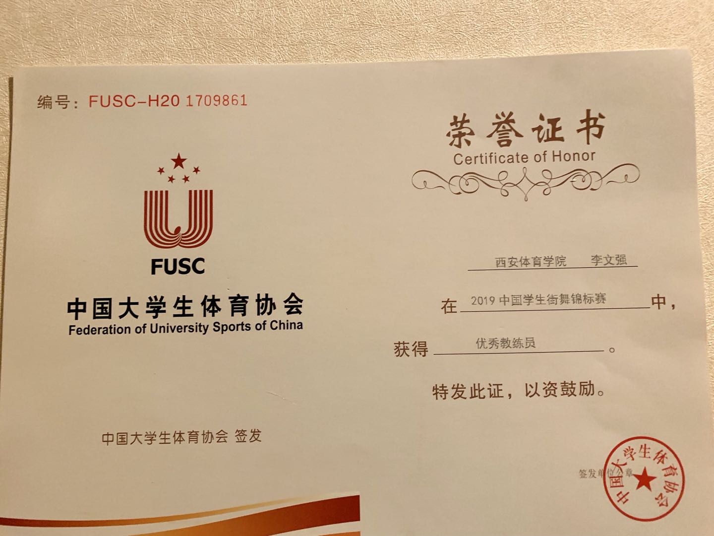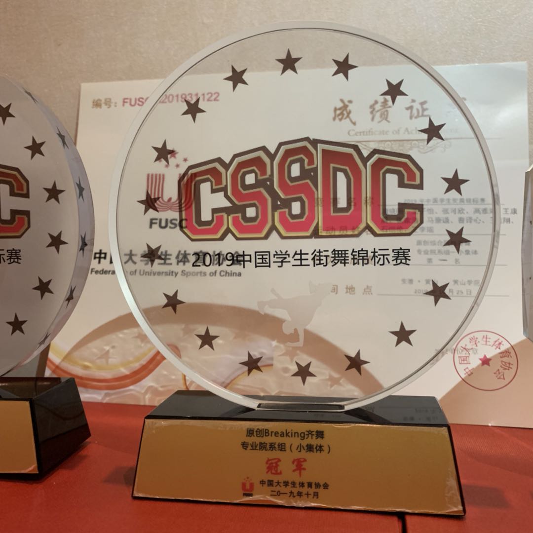 1028日晚,2019年中国学生街舞锦标赛闭幕式暨颁奖晚会在黄山学院体育馆隆重举行,圆满落幕。在此次大赛中,西安体育学院李文强带领我院17名学生齐心协力、争创佳绩,喜获原创齐舞冠军、Breaking齐舞冠军、我院17级时群致获得1V1Breakingbattle冠军、4V4亚军。除此之外本次比赛李文强教师获得优秀教练员奖,队员时群致获得最佳人气奖,团体最佳创意奖、最佳编舞奖、最佳表演奖。张敏老师承担本次比赛裁判工作。