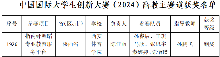 近日,教育部公布中国国际大学生创新大赛(2024)总决赛获奖名单,由陕西省教育厅选送的省级金奖项目——我校艺术学院打造的《指南针舞蹈专业教育服务平台》获总决赛高教主赛道铜奖,这是我校首次在该重大赛事取得国赛奖项。