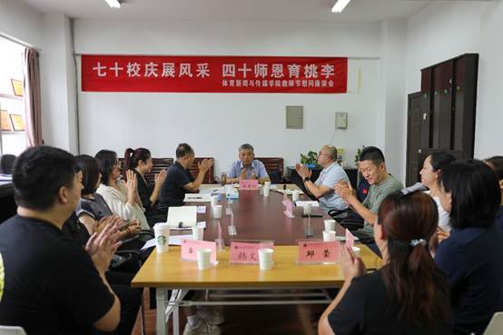 座谈会以“七十校庆展风采,四十师恩报桃李”为主题。首先由体育新闻与传媒学院党委书记马增强致辞,向辛勤在一线工作的教职工表示慰问,并向副校长张葆欣介绍了座谈的老师基本情况。随后由学院教师代表共计16人发言,大家回顾了“我与西体”共同走过的日子,有欢笑、有感动、有奋斗。他们中有进校二十多年的老教师,也有刚入职不久的新教师,大家表示西体见证了自己的青春岁月,老师们也将用自己的努力为西体的辉煌添砖加瓦。老师们在座谈会上积极发言,分享了自己的教学经验和感悟。老师们纷纷表示,将以更加饱满的热情投入到工作中,为学校的七十周年校庆增光添彩,为培养更多优秀的体育新闻与传媒人才贡献自己的力量。